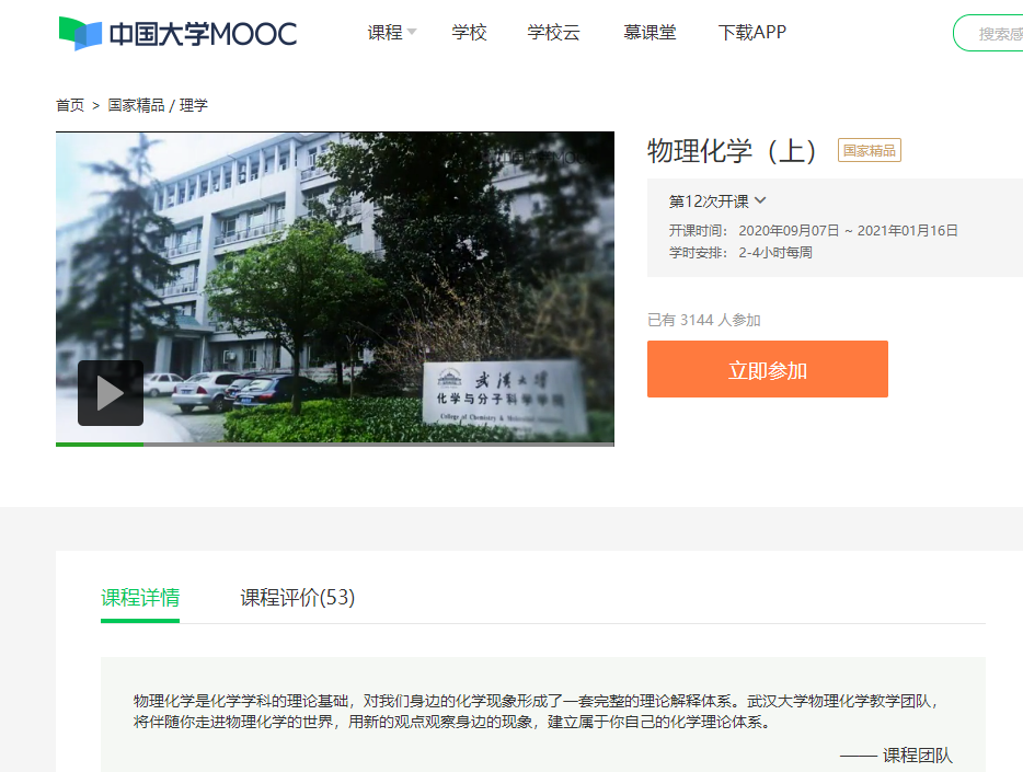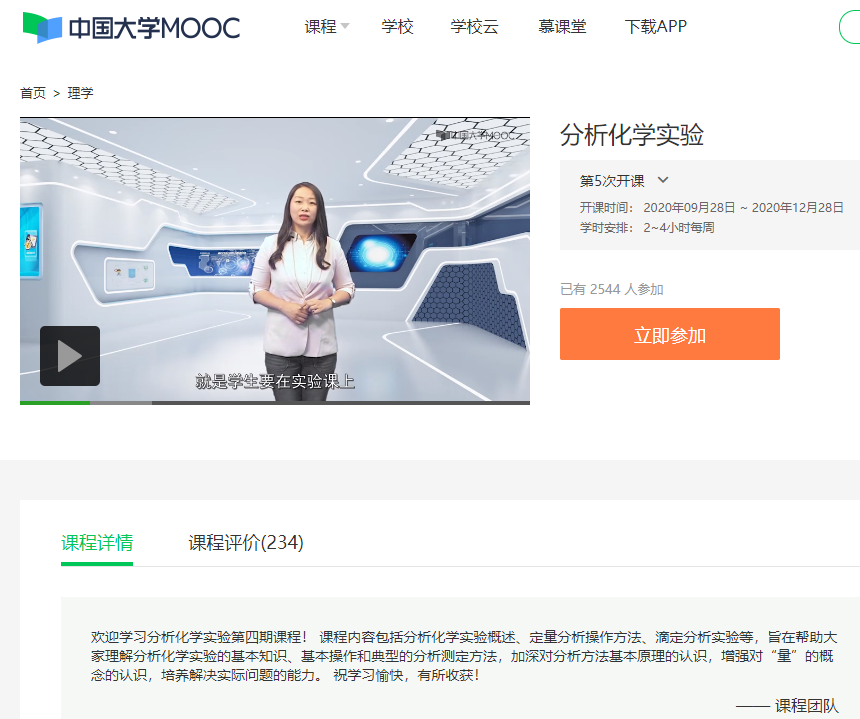 历来高度重视本科教学和本科课程建设,积极努力开展课程团队建设,并利用信息化平台开展线上、线下教学。2017年由王志勇老师负责的《物理化学》MOOC入选了国家级精品在线开放课程、2019年由林毅老师负责的《分析化学实验》MOOC入选了湖北省精品在线开放课程。