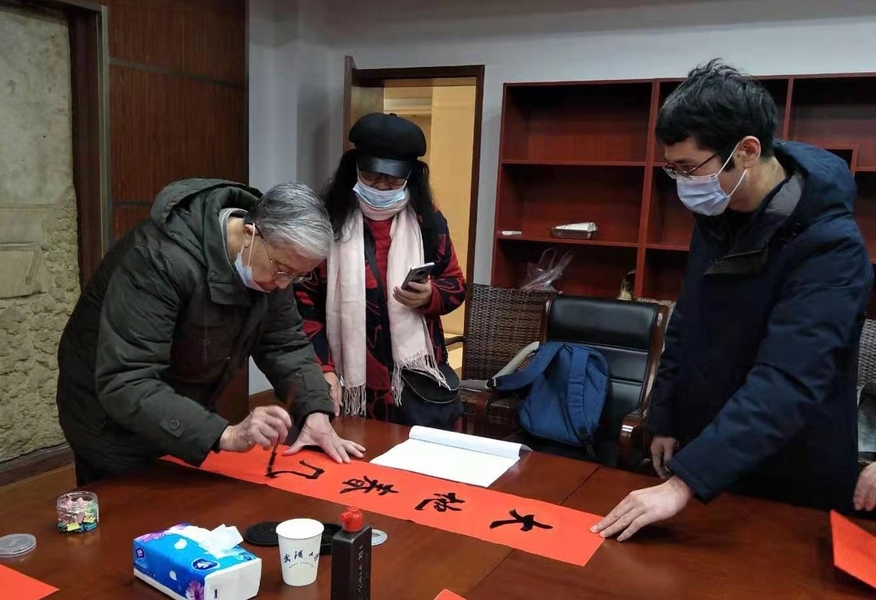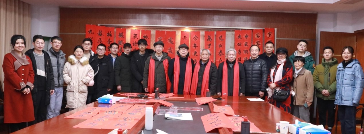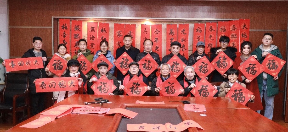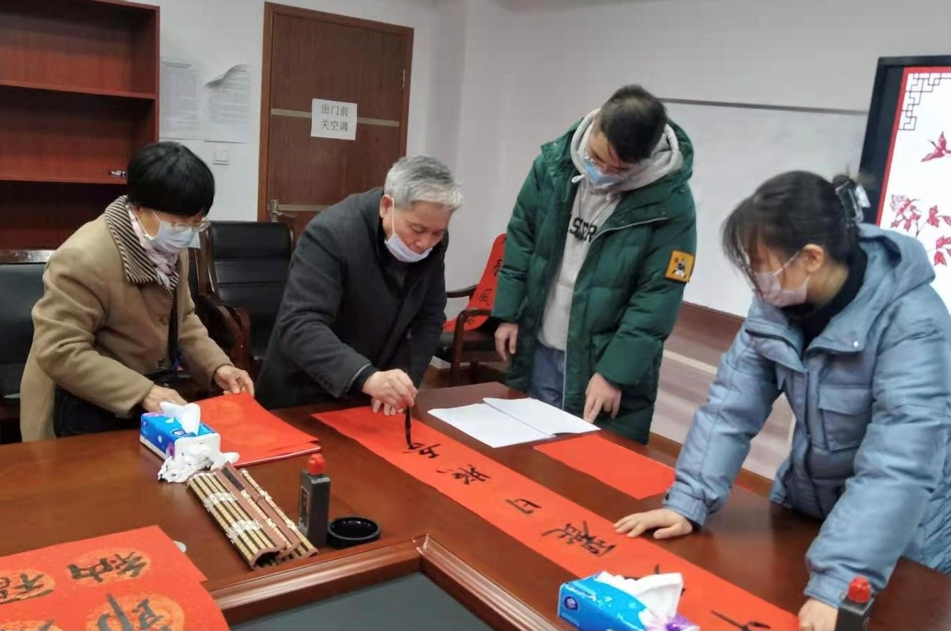 师生书写“福”字和春联,送上年味十足的新春祝福。