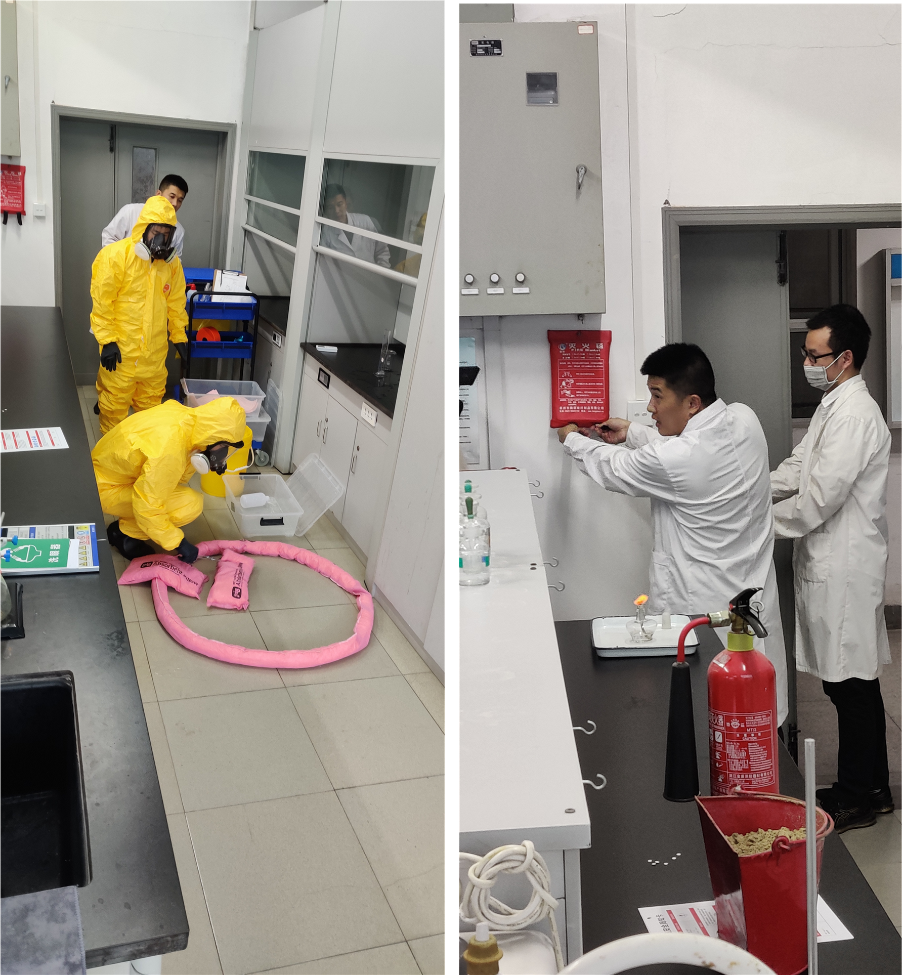 讲座结束后师生们一同前往化东楼实验室观摩学习一场关于危化品泄漏燃烧的专项应急演练。演练现场一名学生在做实验中不慎将危化品泼洒并与皮肤接触,该学生立即赶往最近的地点使用应急喷淋装置对全身进行冲洗,同时应急人员迅速响应,紧急疏散实验室内人员并穿戴好防护用品对泄漏点进行围堵、吸附、回收。演练结束后专业人员示范了如何正确使用消防灭火毯,并介绍了针对五类不同火情的灭火处置措施。