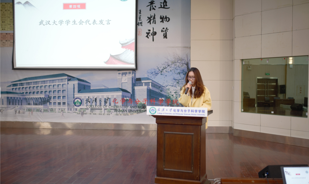 校学生会主席团代表黄雨心同学回顾了过去一年中化院学生会的工作成果,祝愿新一届学生会锐意深化改革,全心全意为同学服务,积极为学校发展建言献策,并预祝本次大会取得圆满成功。