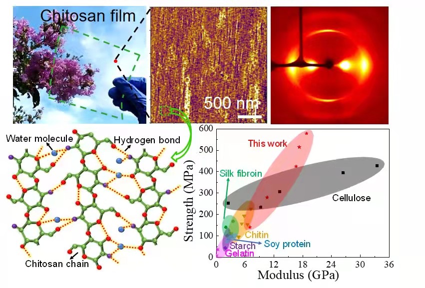 甲壳素是自然界储量仅次于纤维素的天然高分子,壳聚糖是甲壳素最重要的脱乙酰化衍生物。壳聚糖由于固有的生物降解性、生物相容性、抗菌性能等受到广泛关注。然而,传统方法利用稀醋酸水溶液溶解壳聚糖,从溶液中再生得到的壳聚糖材料力学性能较弱,尤其是湿强很差难以满足实际需求。因此,迫切需要开发能够规模化应用的绿色新溶剂并发展高性能壳聚糖材料制备技术。