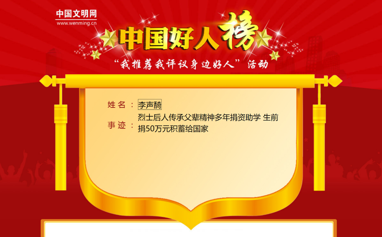 已故离休教师李声䭲教授上榜“助人为乐好人”。
