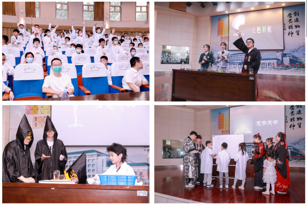 随后,刘海燕老师简要介绍了“魔法知识”——什么是化学?学化学有什么用?紧接着,由志愿者们扮演的“毕业生”们开始了魔法表演。骑着扫帚上场的魔法师带来了神奇的药水唤醒了彩虹;法老之蛇黑魔法伴随火焰徐徐升起;遥远东方寄来的无字天书用水和火破解后,竟是祝小朋友们“六一快乐”的四个字……环环相扣,引人入胜。现场气氛异常活跃,小朋友们争先恐后发言。上台参与魔法表演环节更是高举小手,希望近距离的一探究竟。少儿的灵动好奇与化学魔法的神秘变化碰撞出科学的火花。