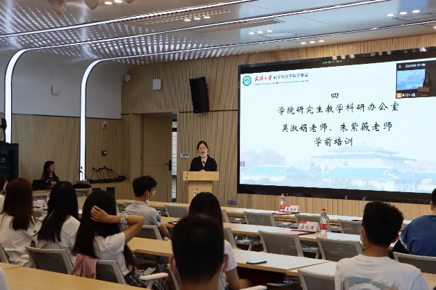 研究生教学科研办公室吴淑娟、朱紫薇,研究生辅导员聂晓迪进行学前培训,对学生的培养方案,毕业要求及一些选课工作进行介绍,让新生快速了解研究生学习生活的基本情况,帮助学生明确接下来的学习规划。
