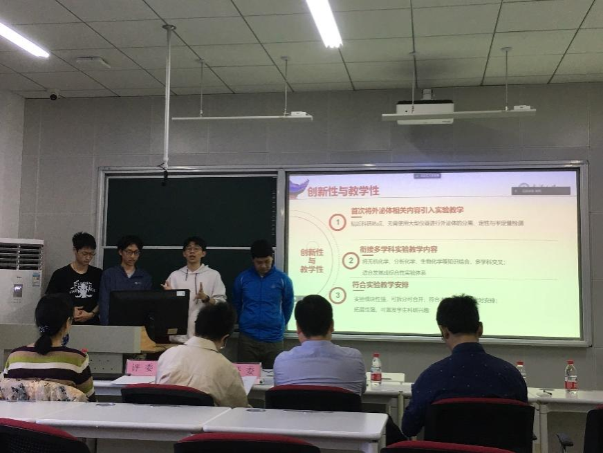 教学指导委员会委员龚淑玲教授和蒋风雷教授作为评委;化学实验教学中心主任赵发琼教授、张海波老师、丁琼老师和钟亚兰老师列席了答辩会。答辩会由周金平副院长主持。