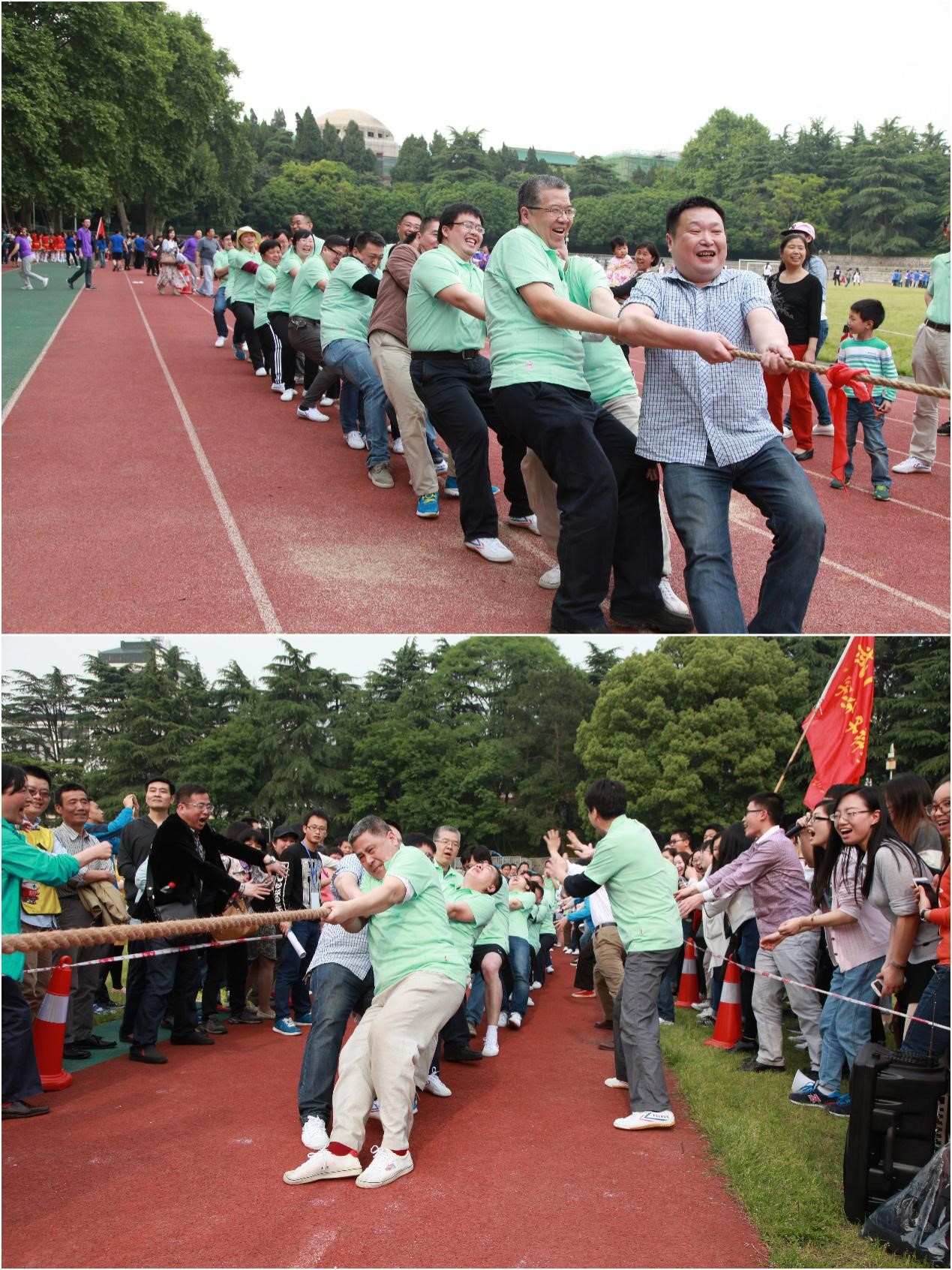 教职工代表在奥场打响了拔河比赛的第一战。参加此次比赛的40余名教职工、近百名由教职工及研究生组成的啦啦队齐聚奥场,院党委书记卢昌宁更是到场亲自指挥,加油助威。