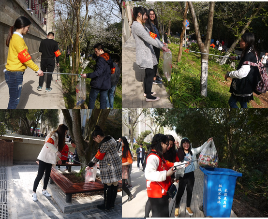 在樱花大道,在情人坡,游客摩肩接踵,这群硕士、博士生戴着“党员志愿者”臂章,他们低着头,忙忙碌碌,无暇去漫步、赏景。打扫草坪、丛林、道路以及校园死角的垃圾,将装满的垃圾倒进垃圾桶里。他们细心地清洁墙壁、路灯杆、树上的小广告,以及地上的口香糖,手脏了,汗水湿了发梢,美丽的樱花飘落在发际也未察觉。遇到乱丢垃圾的游客,他们主动上前,礼貌地劝阻,并向游客宣传文明赏樱。对于外地游客,各位党员也很乐意给他们指路和普及樱花知识。