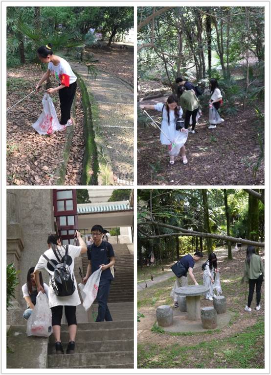 周边,主要针对一些不可降解的白色垃圾、“牛皮藓”等。虽然初夏的天已很热,但所有参与人员都“挽起袖子加油干”,不怕脏,不怕累。在大家的感染带动下,一些游客也纷纷起身,收拾石桌上、石凳旁的丢弃物。经过大家一个小时的劳动,清洁区域回归了原来的绿色和整洁。