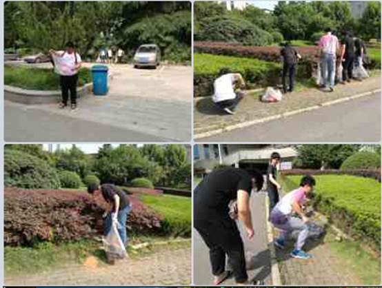 党团员周末义务清洁校园活动规模扩大,后勤集团园林环卫工人也加入其中,活动更为规范。后勤集团党委书记张文军,化学91社区