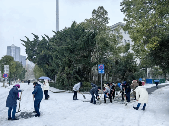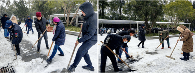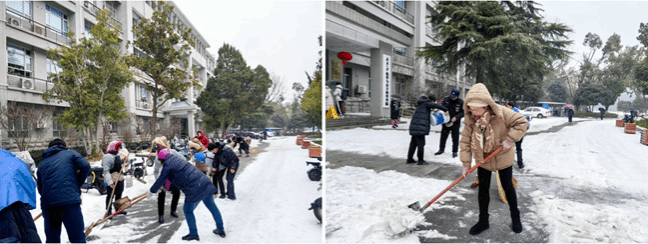2月22日,新学期开学第一天,经一夜雪和霰,校园内银装素裹,却给出行带来不便。为保障师生出行安全,在91社区 领导带领下,机关办公室和物业合力清理91社区 东门和西门道路,大家不惧严寒风雪,干劲十足,铲雪除冰,暖心迎开学。