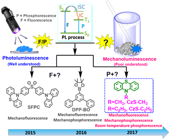2015年科学家首次将聚集诱导发光(AIE)与力致发光相结合,为这一领域注入了全新的活力。然而在以往的研究中,大多数的报导都还局限于力致荧光材料,与之相对应的力致磷光材料却鲜有提及,但是在理论上应该是存在的。在2016年,李振课题组首次发现了一个在室温下具有AIE效应的力致磷光材料DPP-BO,为证明激发三线态存在于力致发光进程中提供了有利的证据(Angew. Chem.-Int. Ed. 2017, 56, 880-884)。但是,还有一点遗憾的是分子DPP-BO在光致发光过程中没有观察到室温磷光现象,只有在低温(77K)下才能看到长寿命的磷光,这为研究力致发光的激发态进程蒙上了一层阴影。