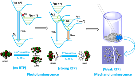 此次的研究中,该团队又发现了一类具有室温磷光的力致发光材料(CzS-CH3 CzS-C2H5), 完美地弥补了以前的研究缺憾。以光致发光为研究模板,他们对力致发光的激发态进程进行了充分的解析。通过晶体堆积的分析,并辅助以理论计算,发现分子二聚体在光致发光和力致发光过程中扮演了重要的角色——在光致发光过程中,分子二聚体的形成有利于分子间电荷转移的产生,从而促进激发单线态到三线态的系间窜越,导致了室温磷光;而在力致发光过程中,分子二聚体在机械力的作用下会发生破裂,从而会限制系间窜越的产生,导致力致发光光谱更加接近于研磨态的光致发光光谱(包括强的荧光部分和弱的磷光部分)。