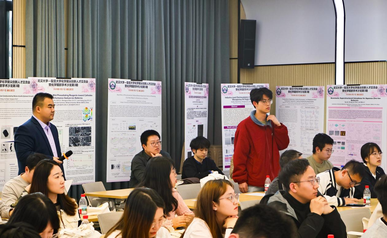 交流会设置了12个口头报告和30个墙报,涵盖合成化学、能源材料、生物医药等多个前沿领域。口头报告环节中,两校优秀博士生代表围绕共价有机框架材料的设计与应用、新型电池技术的开发、纳米材料在疾病治疗中的创新应用等主题展开深入交流探讨。墙报展示区汇集了30项创新研究成果,聚焦介孔材料精准合成、电化学催化机制解析、生物传感技术开发等热点方向。