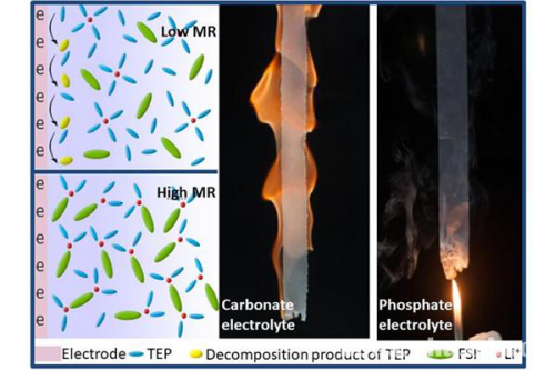 锂离子电池安全性问题一直制约着锂二次电池向电动汽车和大规模储能领域发展,而影响锂二次电池安全性的主要因素是易燃有机电解液的使用。传统的做法是在电解液中添加阻燃剂,曹余良课题组则另辟蹊径,长期致力于非燃磷酸酯溶剂完全替换目前可燃体系,试图从根本上解决这一问题。然而,小分子磷酸酯类化合物在石墨和金属锂负极表面会发生强烈的还原分解,无法形成完整的钝化膜,因此难以实现锂离子的可逆脱嵌,限制了其应用发展。