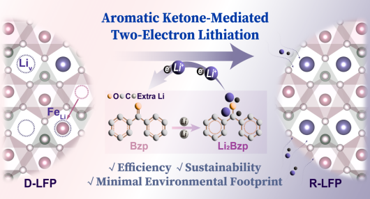 钱江锋课题组在国际化学领域顶尖期刊《美国化学会志》(Journal of the American Chemical Society, JACS)在线发表题为“Aromatic Ketone-Mediated Two-Electron Lithiation for Rapid and Room-Temperature Regeneration of Spent LiFePO4 Cathodes”的研究论文,首次提出了一种基于芳香酮介导的双电子化学锂化新策略,在室温下仅需5分钟即可实现废旧磷酸铁锂正极(D-LFP)的快速直接再生。该论文以91社区