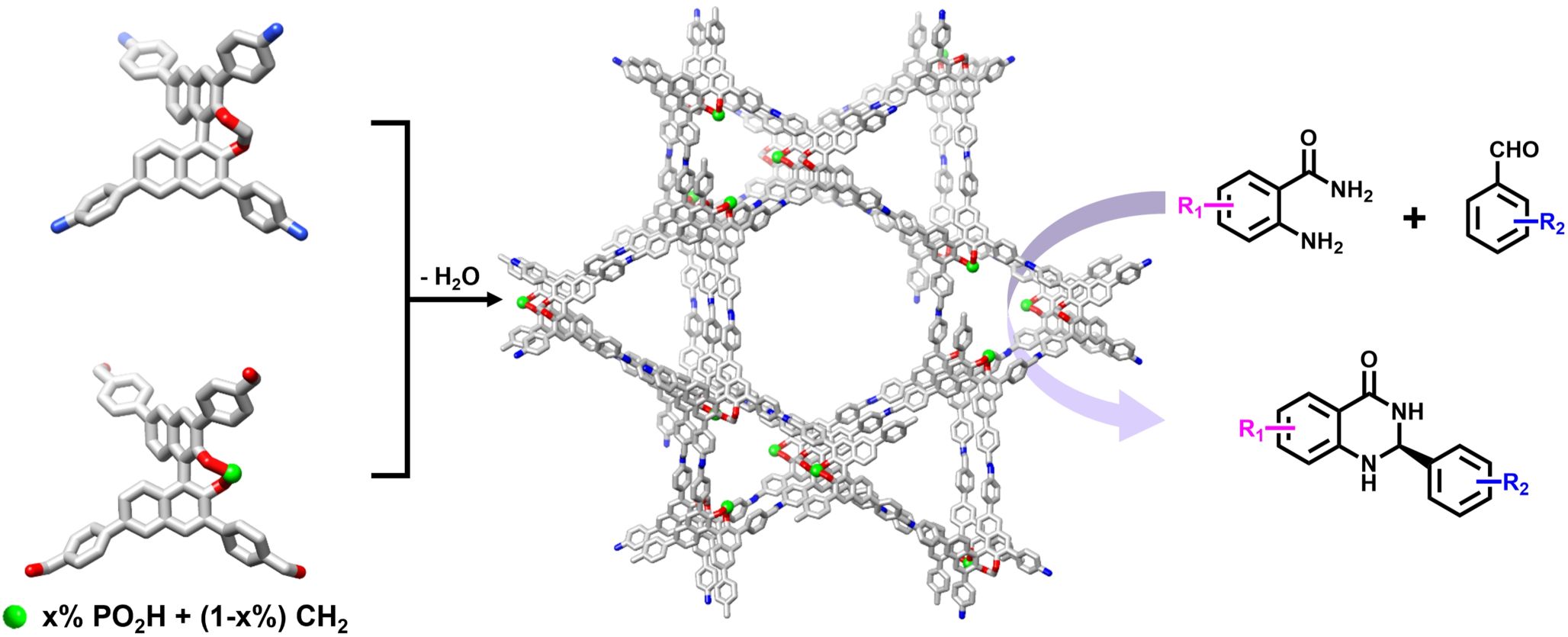 手性化合物在医药和环境领域至关重要,其高效合成常依赖不对称催化。手性磷酸催化剂在不对称催化中应用广泛,但其开放的催化结构通常难以实现立体化学的精确控制,限制了对映选择性的进一步提升。受酶催化启发,将手性磷酸引入晶态多孔框架构建受限手性微环境,已成为一种提高对映选择性的有效策略。然而,大多数多孔材料稳定性不足,限制了其实际应用。共价有机框架(COFs)作为一种新型晶态有机多孔材料,具有稳定性高、孔道可设计和功能可调等特点,是理想的载体材料。但在保持框架有序组装的同时,精准引入立体化学不对称性难度大,手性磷酸功能化三维COF的合成极具挑战。