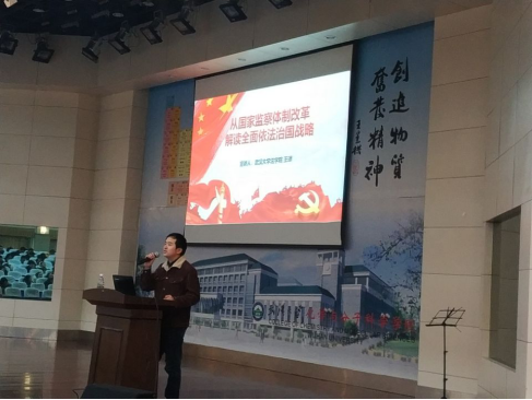王译主要从国家监察体制改革的背景、国家监察体制改革的基本内容、监察体制改革在全面依法治国战略中的意义三个方面进行讲解。首先,王译从全国人民代表大会常务委员会关于在北京市、山西省、浙江省开展国家监察体制改革试点工作的决定这一背景着手,向我们讲解了“留置”这一概念。改革明确提出依法赋予监察委员职责权限和调查手段,用留置取代“两规”措施。接下来,王译详细向介绍了监察委员会的宪法地位、监察范围、主要职责等内容以及国家监察体制改革已取得的显著成效。