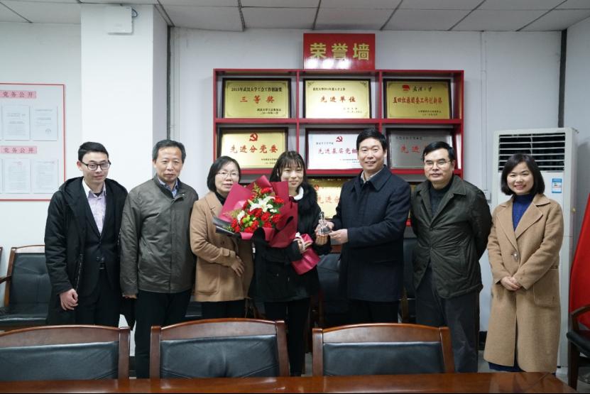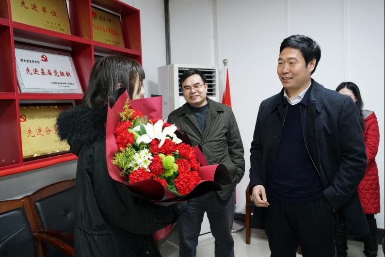 党员活动室里,校党委副书记沈壮海高度表扬了吴雅珣见义勇为的举动和机智妥当的处置,亲切地问候她学习、生活情况,并表达了美好祝愿。