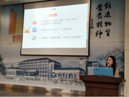 接下来上台的同学是前往拼多多就业的李姗谕同学。李姗谕同学首先就靠精美的PPT封面吸引了台下同学们的目光。在接下来的分享中,她继续谈到人生规划的重要性,为大家介绍了一个“完美通关求职模板”,也是在提醒同学们若要就业,准备越早越好。