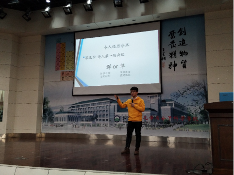 首先上台为大家报告的是拿到TP-link普联offer的朱钊辰同学,他首先简单介绍了本次分享会的流程。接下来结合自己几次找工作的经历,为大家强调了明确人生规划的重要性。朱同学讲述了自己从保研到考研到找工作,一路走来自己的经验。帮助大家对自己未来的方向有一些更明确的认识。