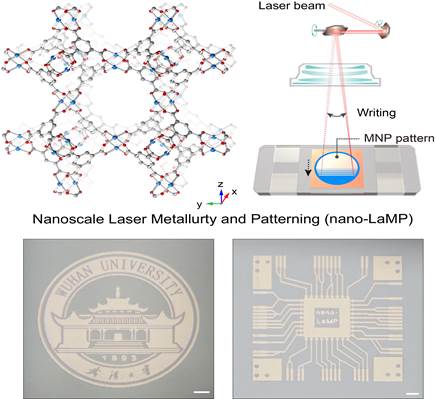 Metal nanoparticles (MNPs) are critical ingredient for the fabrication of devices on nanoscale. However, solvent, vacuum or inert atmosphere are usually used for the preparation of MNPs, due to their sensitivity to oxygen in air, which limit their application in large scale. A team led by Hexiang Deng in College of Chemistry and Molecular Sciences and Gary J. Cheng in the Institute of Technological Sciences, both from Wuhan University, reported a new method for the production of uniform metal nanoparticles in air using metal-organic frameworks (MOFs) as precursor with laser as the energy source. This method, named as Nanoscale Laser Metallurgy and Patterning (nano-LaMP), allows for the printing of MNP patterns in wafer-scale size within tens of seconds, consuming only 5-Watt power (Figure 1), ideally suited for large scale fabrication.