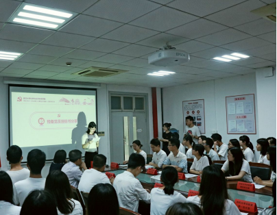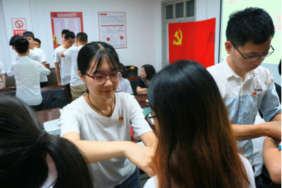 预备党员名单,并对新加入党组织的预备党员们表示欢迎。接着,各位党支部书记为自己支部新入党的同学佩戴党员徽章,并在徐冶琼书记的带领下,齐齐面向党旗庄严宣誓。这整齐洪亮的宣誓声中,既饱含着新加入党员队伍的同志们的决心和信心,也饱含着正式党员同志们重温入党誓词感受涌动初心的激动。