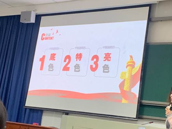 讲座开始,杜莉副教授引入大道行思,取则行远。提出了什么是社会主义?什么是中国特色社会主义?中国特色社会主义为什么好?这三个问题。她主要从中国道路的底色、特色、与亮色进行了分析和解读。