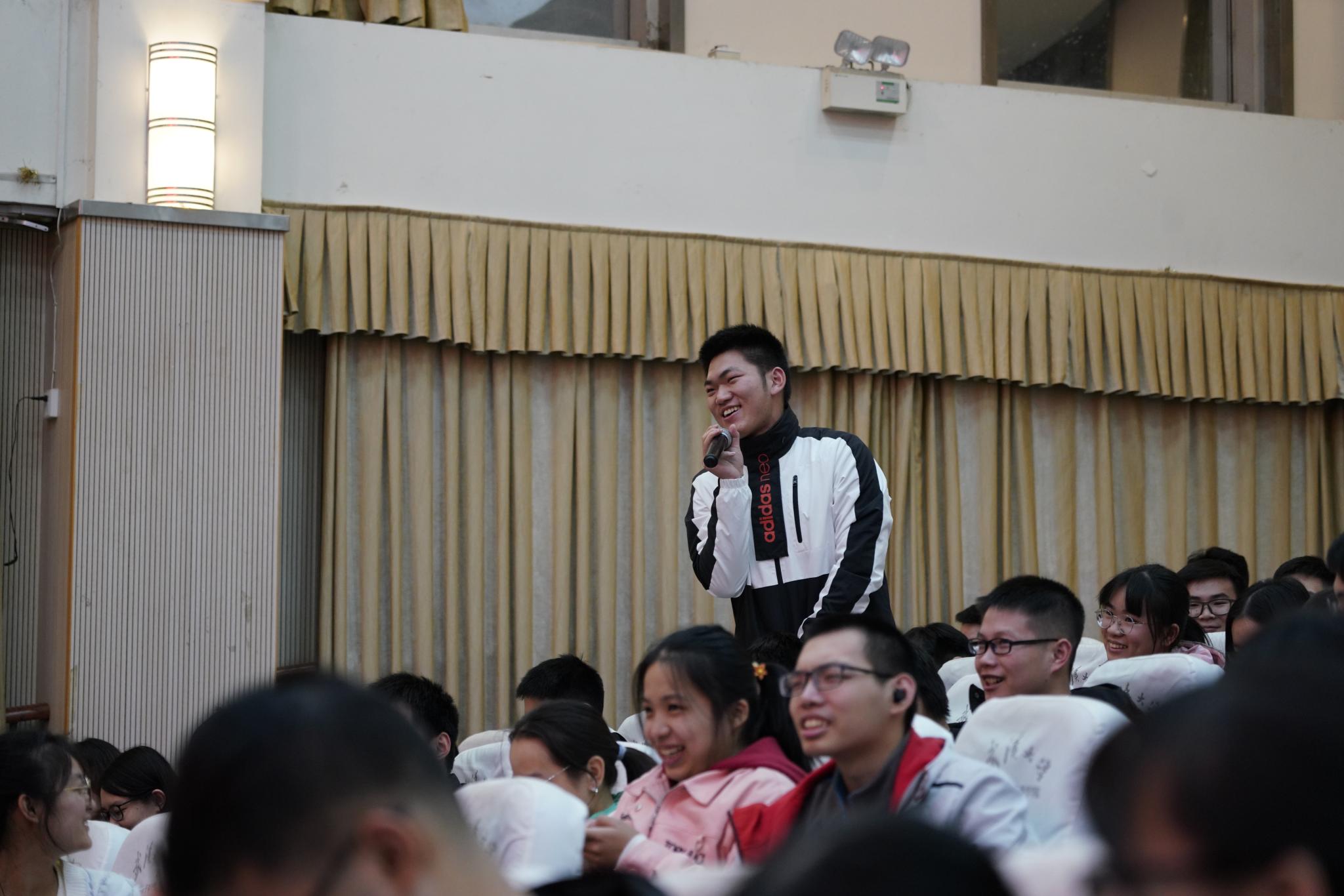 在大会期间穿插着三次抽奖环节,不同的是,中奖者需要回答问题才能拿走奖品。所设问题与大学学习生活有关,被抽中的幸运同学也积极参与,回顾总结过去的一年中的收获,表达了对于老师的感谢,引起了大家的思考和共鸣。