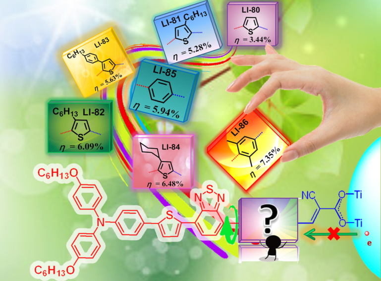 染料敏化太阳能电池作为第三代太阳能电池,是光电领域的研究热点。其实用化的进程与光电转换效率的高低密切相关。作为此类电池的核心组成部分,染料的结构对其光捕获能力和范围,电子的注入、复合和回传等过程起到了至关重要的作用,直接影响到光电转换效率的高低。对有机染料而言,传统的设计理念认为:分子内共轭程度越高,光捕获能力越强,电子传输和注入越有效,从而可以提高染料的光电转换效率。事实上,染料的平面结构也会不可避免地带来一些负面效应,如:染料分子之间的聚集,电子的复合与回传的加剧等,严重制约了此类电池的发展。