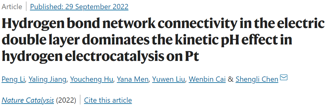 论文题为“Hydrogen bond network connectivity in the electric double layer dominates the kinetic pH effect in hydrogen electrocatalysis on Pt”(双电层中氢键网络连通性决定Pt上氢电催化的动力学pH效应)。