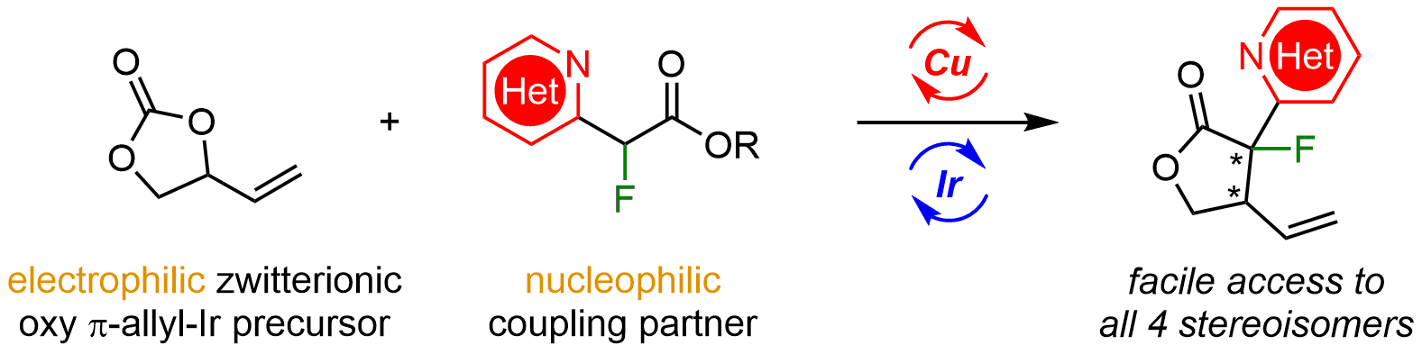 由于环张力和空间位阻的原因,精准实现含相邻叔碳、季碳手性中心α-氟代-γ-丁内酯四种立体异构体的立体发散性合成十分具有挑战性。近期该团队还通过手性Cu/Ir双金属协同催化体系高效实现α-氟代-α-杂芳环酯和VEC的不对称串联烯丙基化/内酯化反应,合成了一系列含有相邻叔碳、季碳手性中心α-氟代-γ-丁内酯(高达98%产率,通常>20:1 dr和>99% ee),并通过两种手性催化剂的不同组合实现其所有四种光学异构体分子精准合成。该论文“Stereodivergent Synthesis of α-Fluoro α-Azaaryl γ-Butyrolactones via Cooperative Copper and Iridium Catalysis”发表在自然科学综合期刊《Fundamental Research》上,博士生田奎为论文第一作者,王春江教授和董秀琴副教授为论文的共同通讯作者。《Fundamental Research》期刊是由国家自然科学基金委主管、主办的高水平综合性英文期刊,内容覆盖自然科学的多个学科领域。