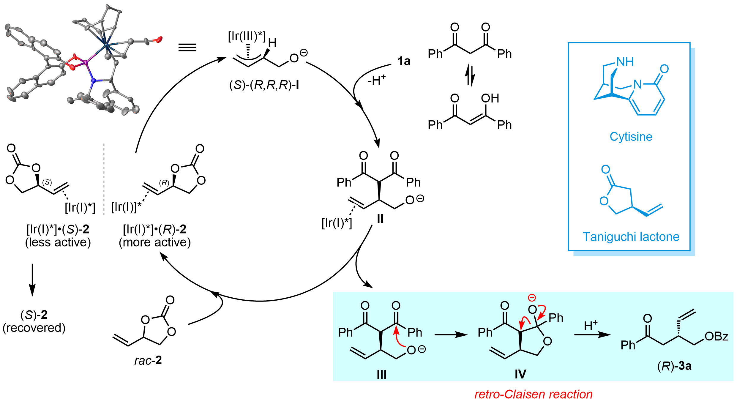 研究团队还对反应机理进行了深入研究和探讨,在一系列控制实验结果的基础上提出了合理的反应路径,并对非对称的β-二酮类化合物在反应中所展示的特殊的区域选择性给出符合Curtin-Hammett原理的解释。同时,该反应在克级规模下能顺利进行,反应收率和对映选择性保持。为了进一步体现该方法学在合成上的应用价值,对反应产物手性3-羟甲基戊烯衍生物进行氢化、环丙烷化、硼氢化和烯烃复分解等一系列衍生化。值得注意的是,以该方法为关键步骤,简洁高效合成了重要手性原料(S)-Taniguchi内酯,并实现了天然产物金雀花碱Cytisine手性关键中间体的催化不对称合成。