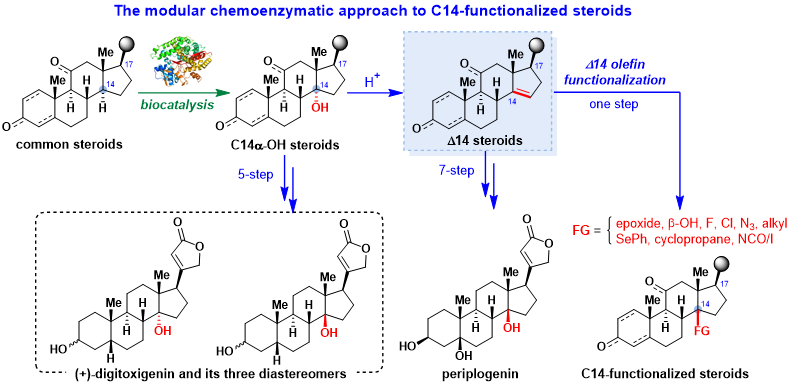 基于该化学酶法合成策略,他们仅需6‒7步就完成了强心苷类天然产物periplogenin、(+)-digitoxigenin及其三种非对映异构体的高效合成,充分展示了该策略在复杂甾体合成中的强大应用潜力。因此,该化学酶法策略不但为新型C14官能团化甾体的合成提供了新思路,也为相关甾体新药的开发铺平了道路。