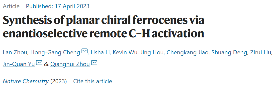 《自然·化学》(Nature Chemistry)发表了周强辉/程鸿刚团队在平面手性茂金属合成领域的重要研究进展,论文题为“Synthesis of planar chiral ferrocenes via enantioselective remote C–H activation”(通过对映选择性远程C–H活化合成平面手性二茂铁)。