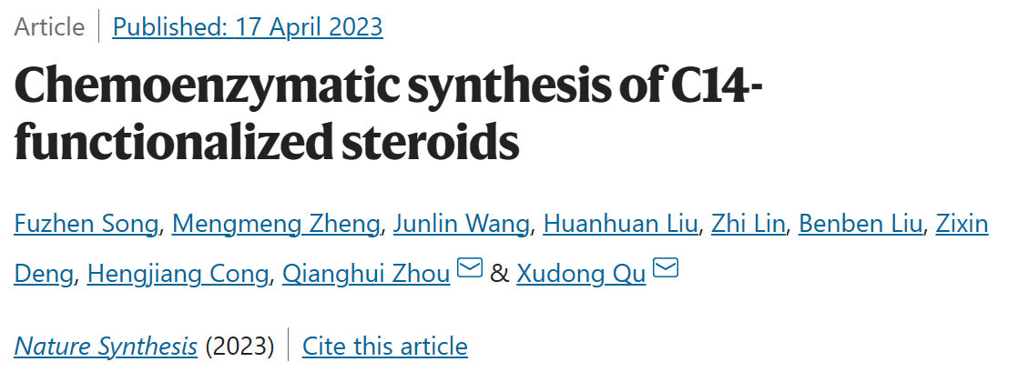 瞿旭东课题组在甾体合成领域的重要研究进展,论文题为“Chemoenzymatic synthesis of C14-functionalized steroids”(C14位官能团化甾体的化学酶法合成)。