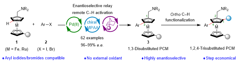 平面手性二茂铁在催化、材料和生物医学等领域得到了广泛的应用,是迄今最重要的一类平面手性骨架。其中,1,3-二取代的平面手性二茂铁具有不同于其他二茂铁的独特性质,例如,它们可开发为具有远程立体诱导作用的手性配体,也可以作为分子机器的独特结构单元,以及在手性二茂铁液晶中具有最高的各向异性和结晶性等。然而,目前对于平面手性二茂铁的合成研究主要集中于1,2-二取代平面手性二茂铁,合成1,3-二取代平面手性二茂铁的研究鲜有报道。目前,1,3-二取代平面手性二茂铁的合成主要采用间接的方式,涉及繁琐的多步操作或手性拆分。通过单取代二茂铁发生远程C−H键活化直接构建1,3-二取代平面手性二茂铁是最具吸引力的一种策略,迄今未能取得突破,主要原因是单取代二茂铁的既有官能团与茂环间位C−H键的距离较远,难以实现有效的导向活化。因此,这是公认的平面手性合成领域的一个难题。