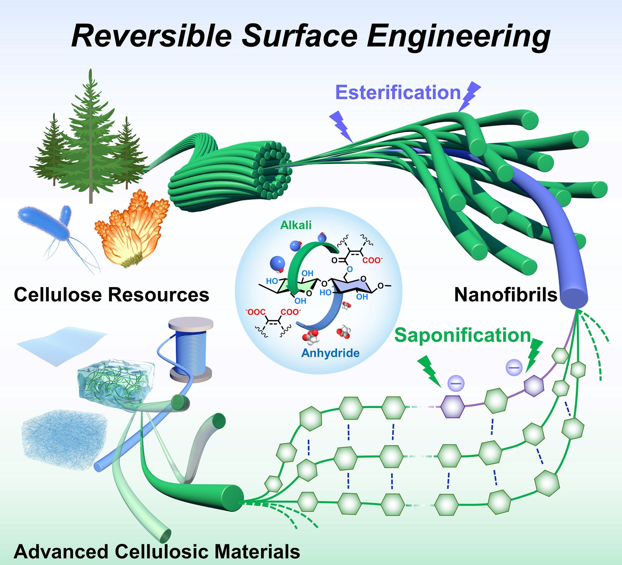 基于上述挑战,常春雨教授课题组提出以碱/极性有机溶剂体系LiOH/DMSO为纤维素的准溶剂,环酸酐为酯化试剂,实现了纤维素原纤维的自发剥离,进而形成个体化的CNFs。这一可逆的表面工程策略为从天然纤维素中剥离超高长径比CNFs提供了更加简易、高效的新思路,设计的准溶剂溶胀作用取代了传统机械处理,降低了整个过程的能量消耗、设备需求以及对CNFs的结构破坏。此外,利用酯基皂化反应的特性,CNFs之间静电斥力能够被完全消除,实现材料内部的氢键重组,显著增强宏观材料的结构强度。这使得CNFs从制备到组装具有更加广阔的应用前景,并为开发高强度、可持续的天然纤维素材料提供了一个平台。
