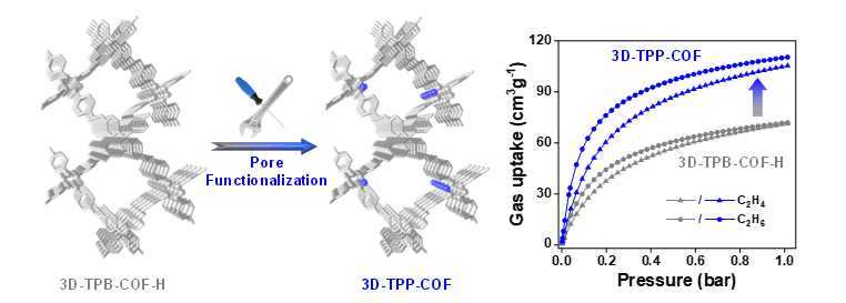 在刚性三维COF方面,他们通过引入吡啶功能单元,精准调控孔道环境,定制合成了一种具有反转吸附特性的高结晶性刚性三维COF(3D-TPP-COF)。研究发现,相比于同构的3D-TPB-COF-H(Angew. Chem. Int. Ed., 2019, 58, 9770), 3D-TPP-COF中的吡啶基团与乙烷分子形成额外的C-H···N相互作用,可显著提高乙烷吸附量和乙烷/乙烯吸附选择性,进而实现乙烯的高效一步提纯。此研究对开发具有特定孔道环境的三维COF并用于高效气体吸附分离提供了指导。相关成果发表在《自然·通讯》(Nature Communications)上,2023届博士谢阳、中国科91社区