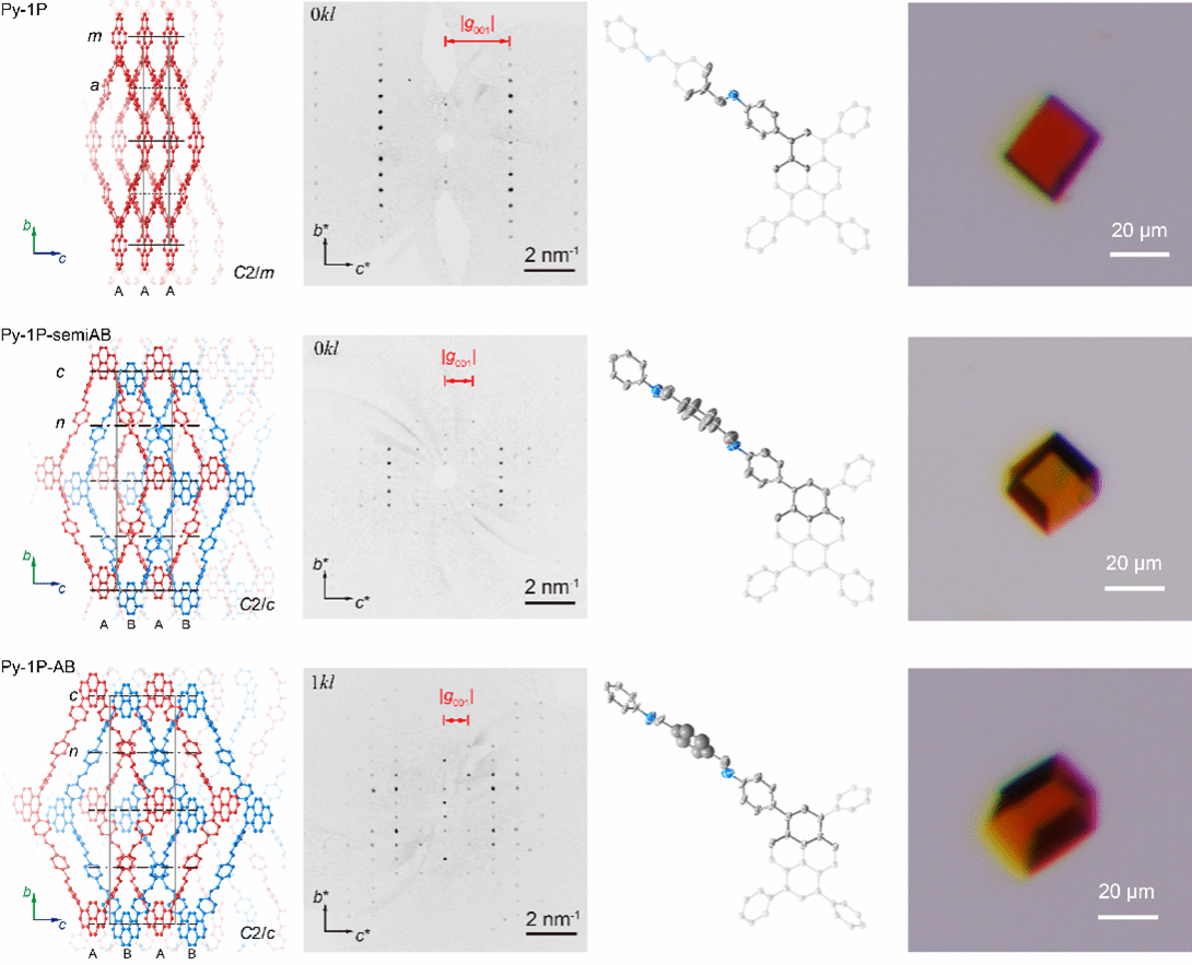 在此工作中,研究人员成功的实现了九种2D COF的高质量单晶生长,以Py-1P 为例,晶体尺寸最大达45 μm (图一)。通过“结构解析金标准”——单晶X射线衍射,研究人员获得了这些2D COF在常压溶液环境下的原子级精确结构,分辨率高达0.85埃,从而成功揭示了此前难以获得的2D COF层间堆叠模式,倾角,层间距,窗口尺寸等真实信息,为研究其动态演变行为提供了明确的结构支撑。研究发现,2D COF由AA堆叠分步向AB堆叠模式转变,其结构参数如倾斜角度、层间距等的变化是非线性的(图一)。AB堆叠的层错为晶格的1/14和1/20,拓展了人们对2D COF的认知。