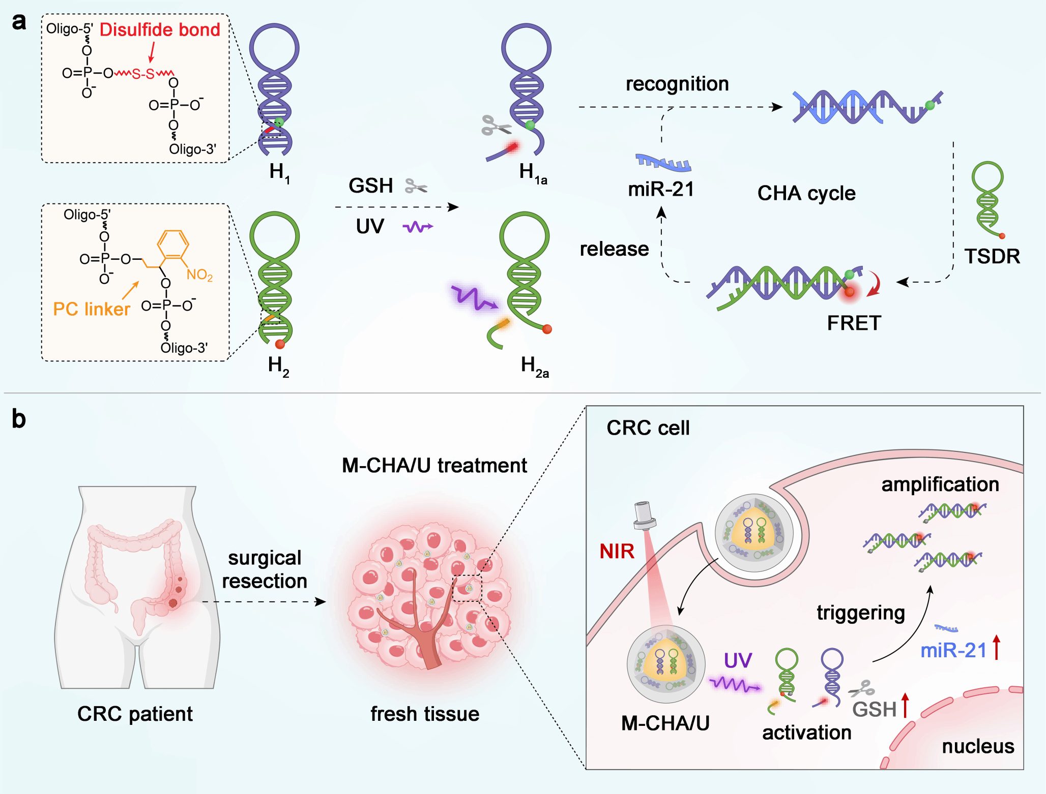 结直肠癌(CRC)是一种常见的消化系统恶性肿瘤,是癌症相关死亡的主要原因之一,严重威胁着人类健康。microRNA(miRNA)作为小型单链非编码RNA,是一种重要的内源性基因调控因子,参与了众多生物学过程,其异常表达已被证实与CRC患者的低生存率和远处转移发展密切相关。先前的研究表明,CRC中高水平的miRNA-21能够下调核心错配修复蛋白hMSH2的表达,这将进一步导致化疗药物5-FU诱导的G2/M损伤停滞和细胞凋亡显著减少,最终严重影响CRC患者的治疗效率。因此,对CRC中异常表达的miRNA进行成像是了解其生物学作用机理的一种很有前景的方法。然而肿瘤区域中的靶标miRNA丰度低且大多数靶标miRNA也以不可忽略的水平存在于正常组织中,从而导致成像信背比低下,因此实现精准的靶标miRNA成像仍存在挑战。