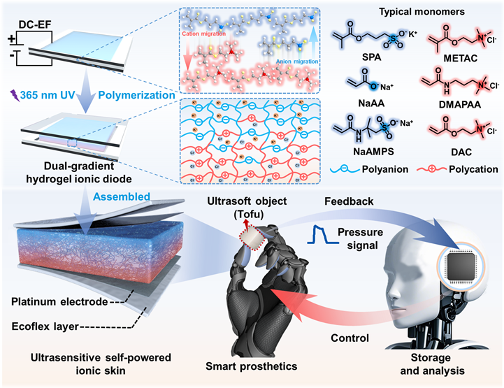 基于上述挑战,本研究提出了一种通过直流电场诱导制备双梯度水凝胶离子二极管的通用方法,该方法制备的水凝胶离子二极管具备一体化结构,且水凝胶中固定电荷呈现双梯度分布,能够有效改善传统双层结构的界面问题,显著提高灵敏度(1247.3 mV/MPa)并具有超低的检测下限(0.8 Pa)。此外,将自供电双梯度水凝胶离子二极管传感器应用于仿生假肢,通过建立精确的假肢控制系统,可以实现对超软物体(如豆腐)的无损抓取。该工作为研发适用于仿生假肢、软体机器人和人机交互的新型自供电柔性传感器提供了新思路。
