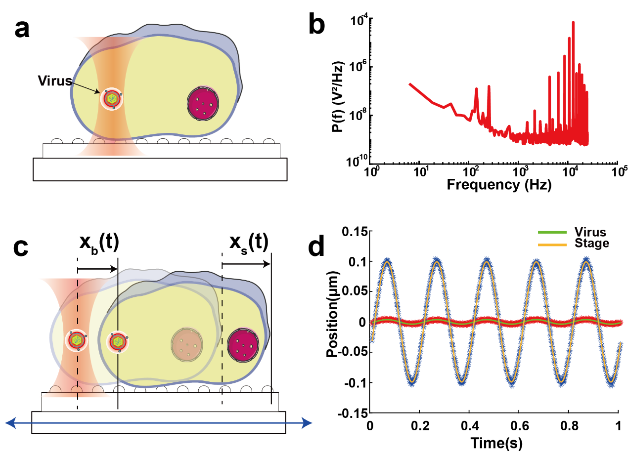该课题组将被动校正(分析病毒受布朗运动影响的相对位置信息)和主动校正(施加正弦振荡力,采集病毒和载物台信号)结合起来,成功实现了细胞内病毒光阱刚度的校正。该技术不仅实现了国际上首次活细胞内病毒的捕获,同时还能实现其光阱刚度和粘弹性模量的原位测定。