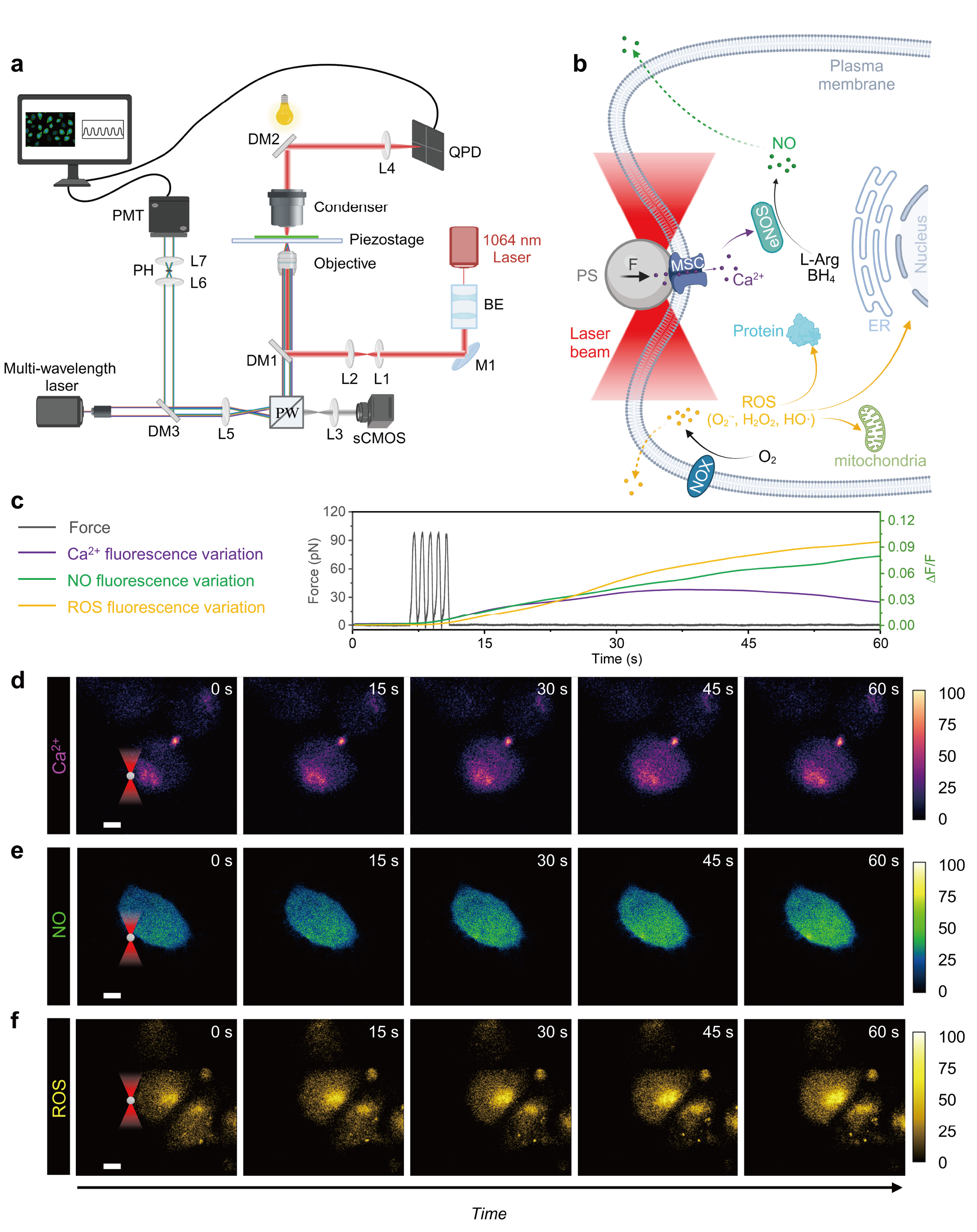 图2 基于光镊-激光共聚焦成像研究细胞的pN级力依赖性Ca2+/NO/ROS信号转导