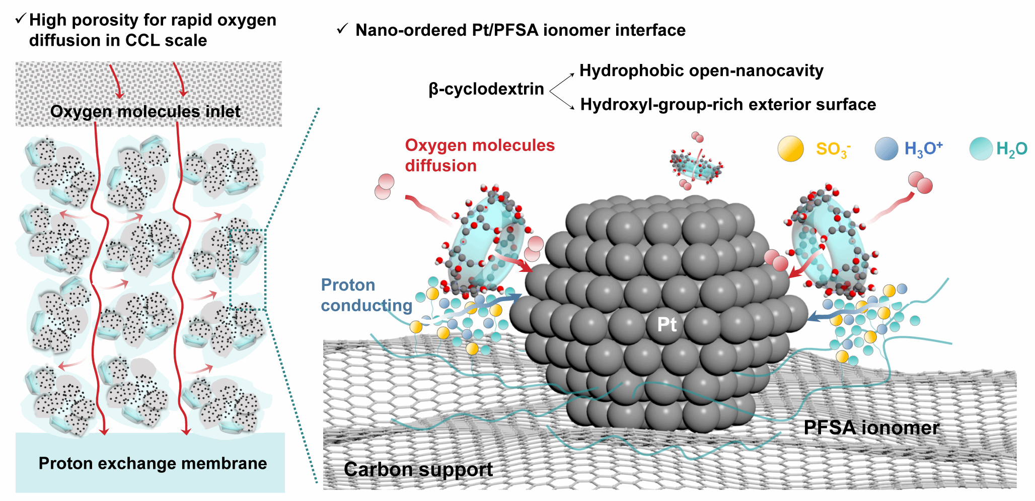 针对上述问题,陈胜利研究团队提出了一种基于分子间作用驱动的自组装策略,以高效缓解Pt/离聚物界面吸附并构建有序、分离的多尺度传质通道。研究中在CCL内引入具有特殊几何与化学结构的β-环糊精(β-CD)作为分子调节剂,通过系统的物理表征、电化学测试与分子动力学模拟等手段,揭示了β-CD外表面丰富羟基与PFSA离聚物侧链间的氢键相互作用可调控PFSA的自组装行为,这不仅有效抑制了磺酸根对Pt表面的吸附,并构筑了连通有序的亲水域供质子传输,而组装体的大位阻效应也增加了CCL的孔隙率;同时,β-CD的疏水纳米空腔可为Pt/离聚物界面处的氧气传输提供快速通道。因此,基于此分子组装策略构建的CCL及其Pt/离聚物界面不仅具有充足的催化活性位点,还实现了氧气与质子传输通道的有序分离,从而显著提升了PEMFC的输出性能。