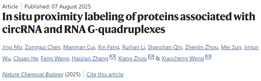 翁小成/周翔团队联合医学研究院张好建课题组在《自然·化学生物学》(Nature Chemical Biology)在线发表题为“In-situ proximity labeling of proteins associated with specific circRNA and RNA G-quadruplex”的研究论文。莫婧博士、陈宗贵博士、崔嫚嫚博士为本文的共同第一作者,翁小成教授、周翔教授和张好建教授为论文的共同通讯作者,91社区
