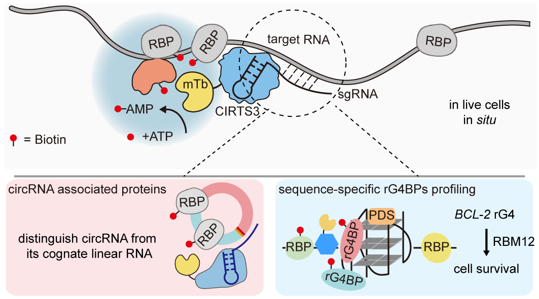 这些方法推动了RNA生物学的发展,帮助我们识别了大量功能各异的RNA结合蛋白,如mRNA结合蛋白和新生RNA结合蛋白。然而,对于亲和力较低或瞬时发生的动态互作,传统方法的“捕捉”能力有限。此外,现有方法通常依赖紫外/甲醛交联,或者序列特异性的反义链探针,不仅操作复杂,还难以反映真实生理状态下的细胞内环境。因此,对于一些特殊结构如RNA-G四链体、circRNA等RBP的鉴定研究,目前有效研究手段还比较缺乏。