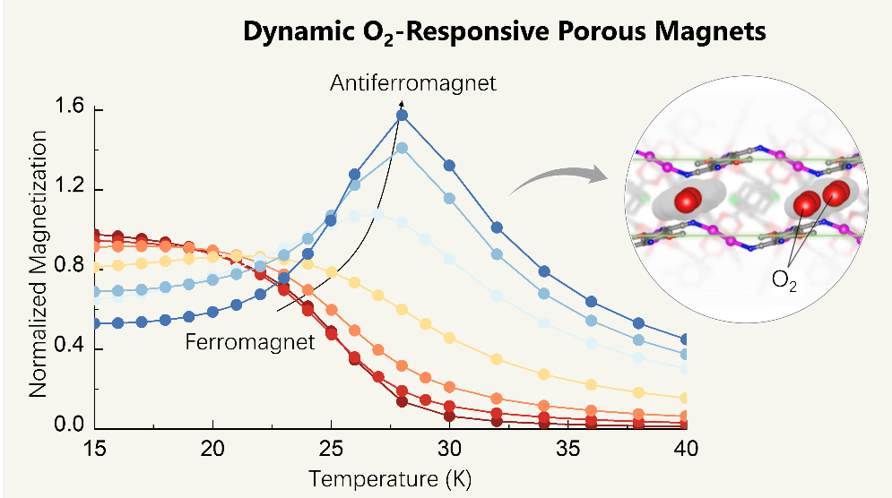 多孔磁体是一类兼具多孔性和磁性的分子基材料,因其可实现可控磁性切换与信息存储、低能耗自旋电子学器件、磁传感与环境监测等潜在应用而备受关注。其独特的开放孔道结构使其能够通过吸附客体分子调控电子与自旋构型,从而实现磁性的切换与调控。气体分子具有快速吸脱附和低损伤性,被视为理想的客体分子。然而,气体与框架的作用较弱,磁性调控效果有限。因此,如何突破气体与框架作用弱、缺乏有效自旋耦合通道的局限,建立气体分子自旋直接驱动的动态磁相演变机制,成为该领域亟待解决的核心科学难题。