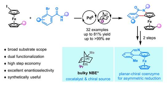 平面手性二茂铁因其独特的立体构型与性质,在不对称催化、功能材料以及药物研发等领域具有重要应用价值。传统合成方法通常依赖预装手性辅基或使用化学计量的手性碱,官能团兼容性不好以及原子经济性不高,制约了其实际应用。过渡金属催化的不对称C–H官能团化是构建平面手性二茂铁的有效策略,然而现有方法通常需预装导向基,且大多仅能实现单官能团化。该研究实现了一种“从头”构建平面手性二茂铁的新策略:利用钯/手性降冰片烯(NBE*)协同催化,以大位阻(C1,C4)-桥头修饰的手性降冰片烯作为共催化剂和手性源,从简单易得的碘代二茂铁出发,一步构建两根化学键,高效合成了一系列平面手性菲啶酮类二茂铁。该方法具有反应条件温和、底物适用范围广、官能团耐受性优异以及步骤经济性高等特点。