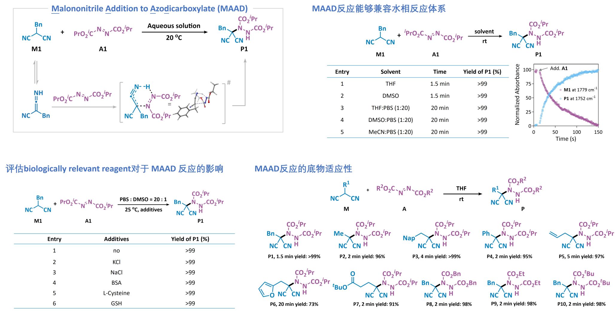本工作中,研究团队发展了以丙二腈与叠氮二羧酸酯为反应对的MAAD生物正交反应。该反应无需额外催化剂和添加剂,在室温、水溶液及生理条件下即可快速、定量进行,在宽pH范围、离子强度及谷胱甘肽、蛋白等复杂背景下仍保持高选择性和高转化率,底物易于合成和改造,展现出优异的生物兼容性和通用性。