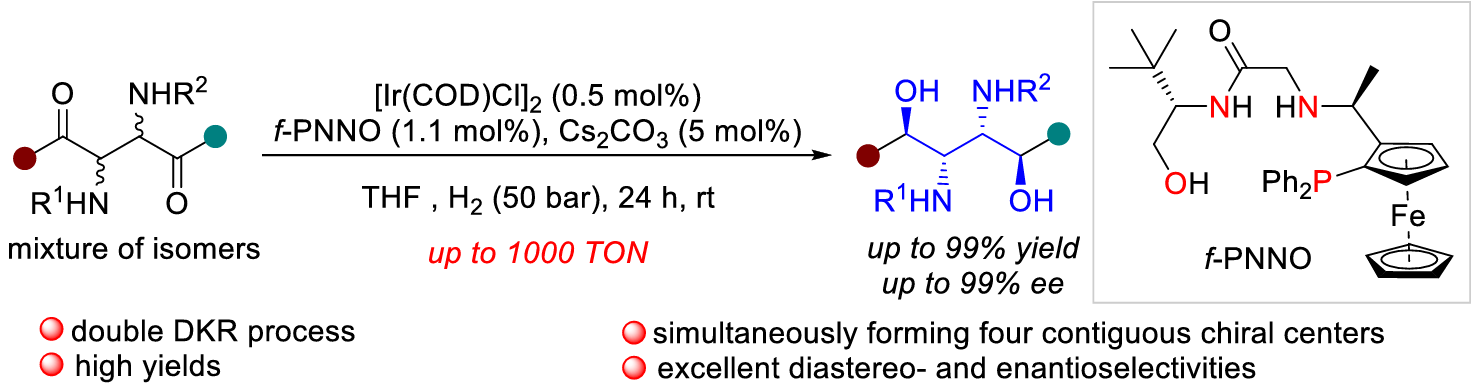 在本研究中,他们利用课题组开发的Ir/f-PNNO催化体系对外消旋2,3-二氨基-1,4-二酮的不对称氢化进行研究,利用连续动态动力学拆分策略,实现了含四个连续立体中心的手性邻二胺的高效合成。值得注意的是,该反应展现出优异的对映选择性和非对映选择性,能立体专一性地从32种可能的还原产物中生成单一目标手性分子。该反应的底物普适性好,催化效率高,使用0.1 mol % 的催化剂即可顺利实现产物克级规模的制备,为结构多样、功能丰富的手性邻二胺的高效合成提供了简捷实用的新途径。此外,所得产物中的手性邻二胺及氨基醇单元具有丰富的化学转化,可广泛应用于配体以及手性功能分子的合成中。机理研究表明,该转化经历了两次动态动力学拆分过程。该论文所发展的双动态动力学拆分策略为含多个连续手性中心链状分子的高效构建提供了新思路,具有重要的学术价值和潜在的应用前景。